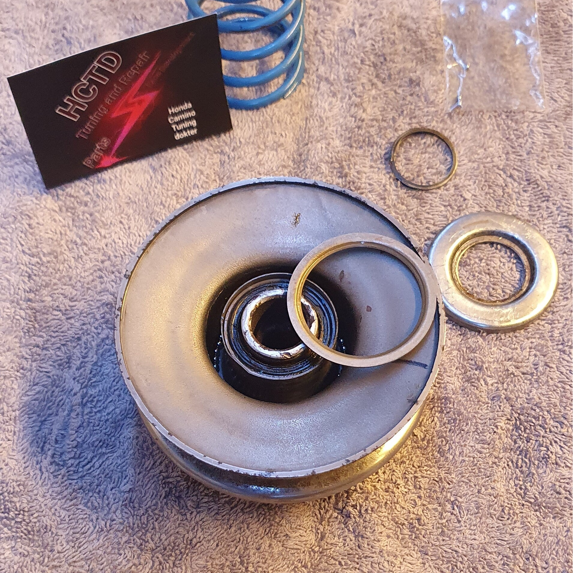 Onze torsion controller is een lagersetje voor de achter poelie met de 2gaten. dit setje word onder de drukveer geplaatst en zorgt hierbij voor een opdrukking van de veer en neemt de torsie op de veercup weg waardoor er minder kans is op een loskomende borgclip, ookzorgt dit voor een soepelere werking van de achtervario